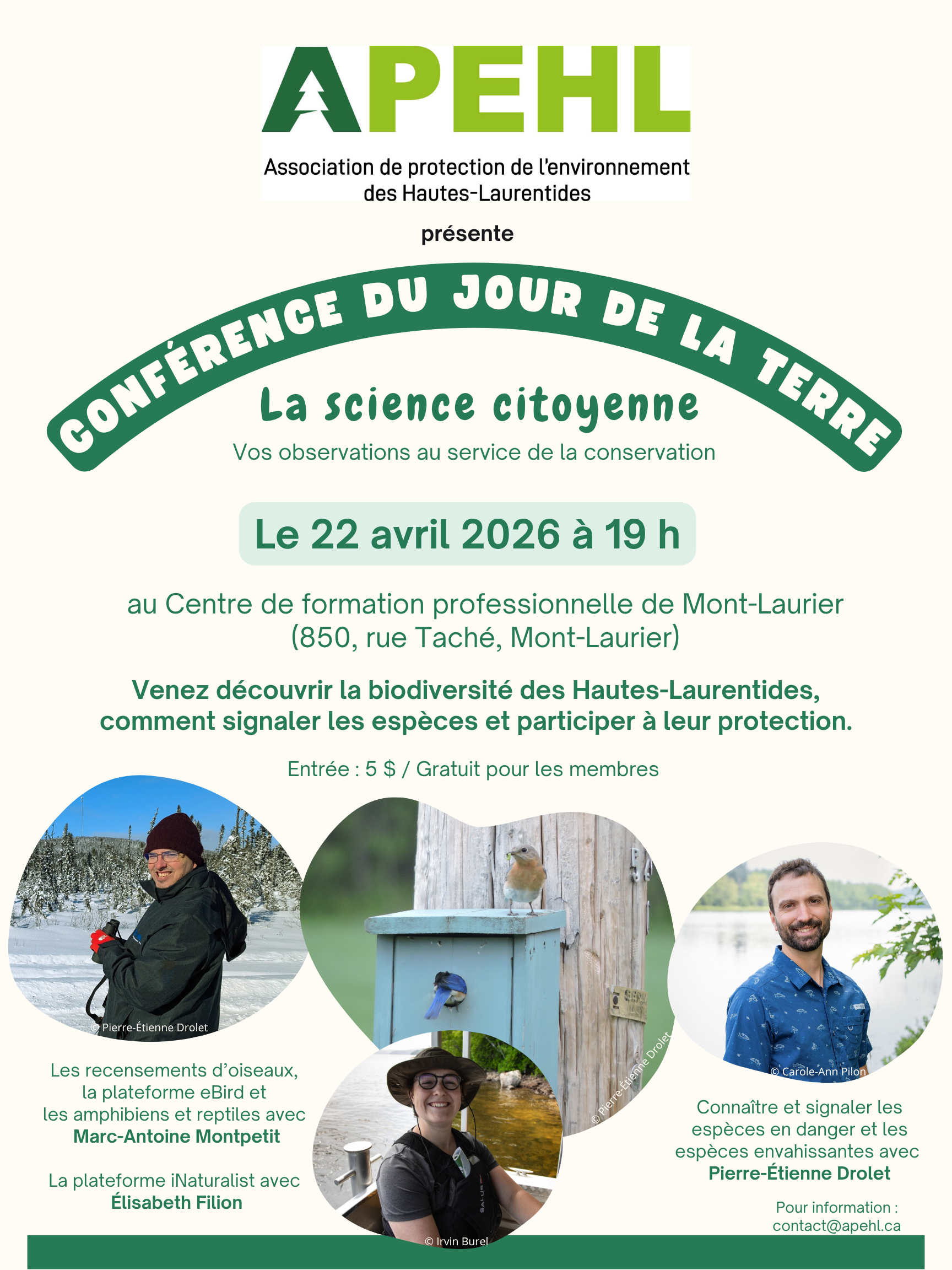 À l'occasion du Jour de la Terre, l'Association de protection de l'environnement des Hautes-Laurentides (APEHL) vous invite à une soirée conférence sur le thème « la science citoyenne, vos observations au service de la conservation ».